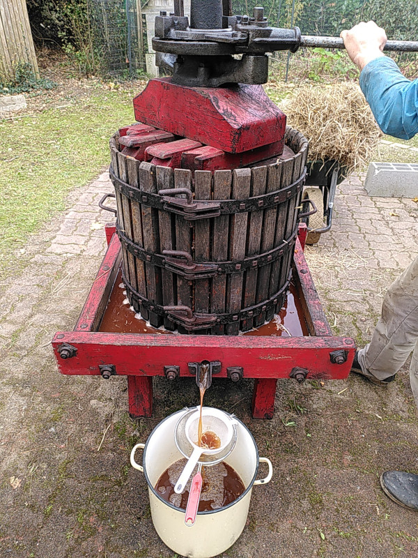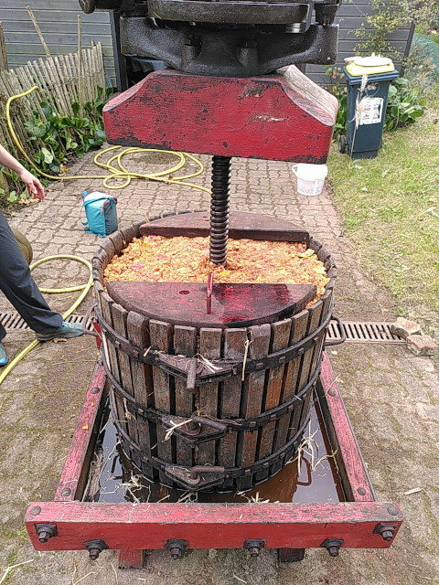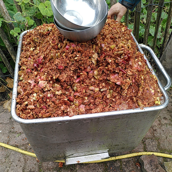 4 – On met le broyat de pommes dans le pressoir (il faut humidifier le pressoir quelques jours avant pour l’étanchéifier).
