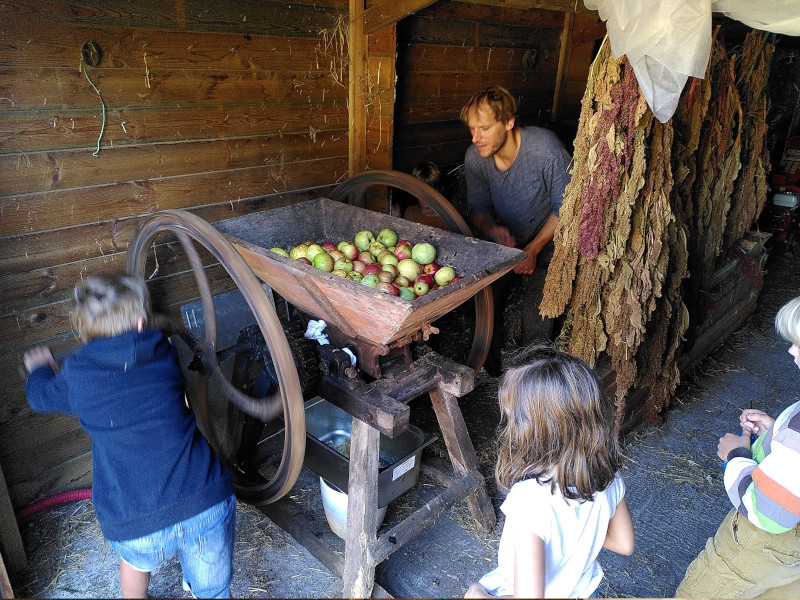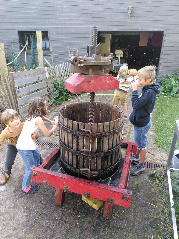 Tous les automnes depuis trois ans, nous allons faire du jus de pomme chez nos amis Roland, Florence et leurs enfants Julia et Jean. C’est devenu un rituel. Une année sans pressée de pommes serait une année ratée je dois dire. Ce moment nous accompagne pendant le reste de l’année, à chaque fois que nous ouvrons une nouvelle bouteille.